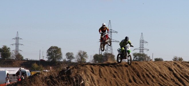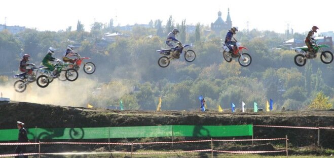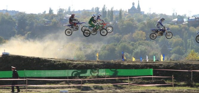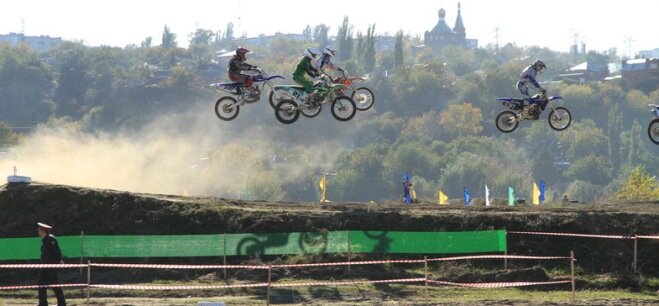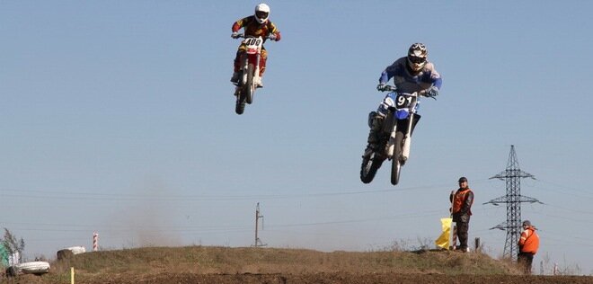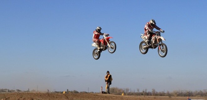 Двое из участников соревнования по мотокроссу следуя друг за другом подлетают на трамплинах в высоту порядка на 2-х метров. В это момент самое главное, удержать равновесие на мотоцикле, что при приземление не упасть.